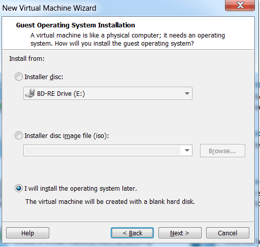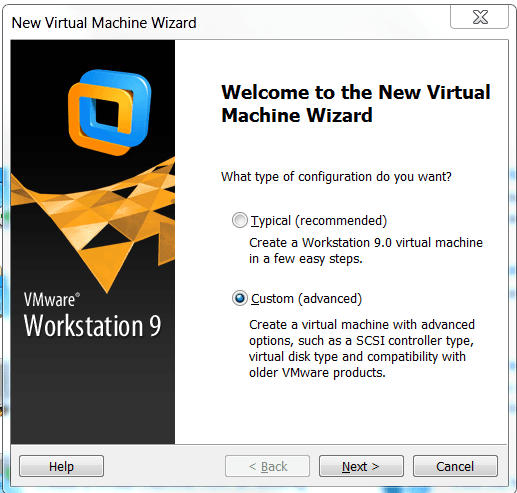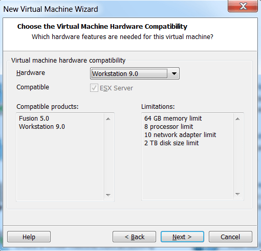The default Hardware Compatibility is Workstation 9.0, click next and choose to install the OS later