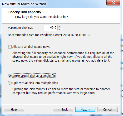 Large files are not a problem so we will change to “Store virtual disk as a single file”