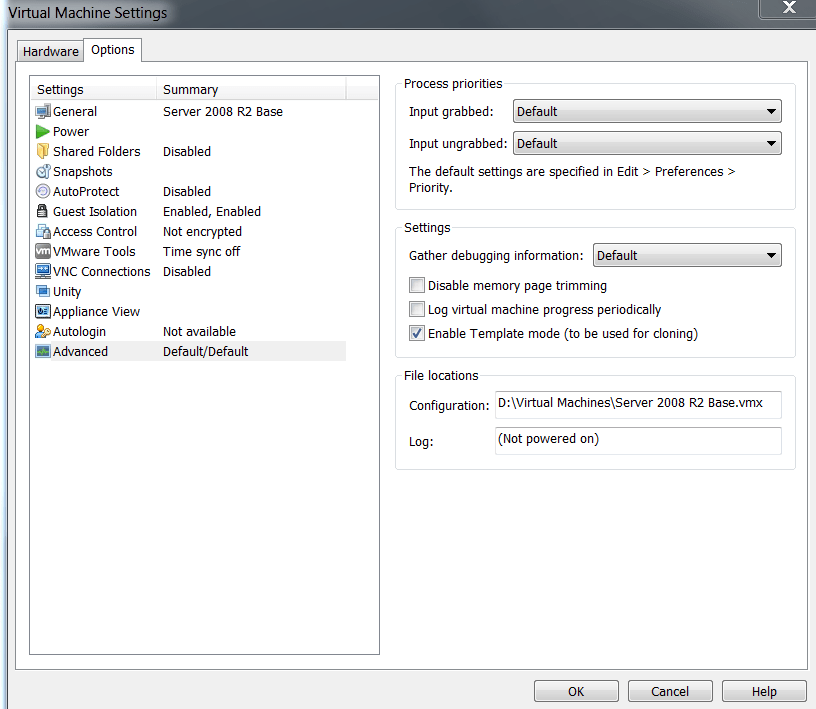 Now that we have the virtual machine ready we will go ahead and load Windows Server 2008 R2. I won’t bore you with screen shots as I am sure you have done this install 1000+ times. After the install we will update the OS and run sysprep and select the OOBE and check generalize and select shutdown. Once the VM is shut down we can go into the advanced options under “edit virtual machine settings” and check “enable template mode”